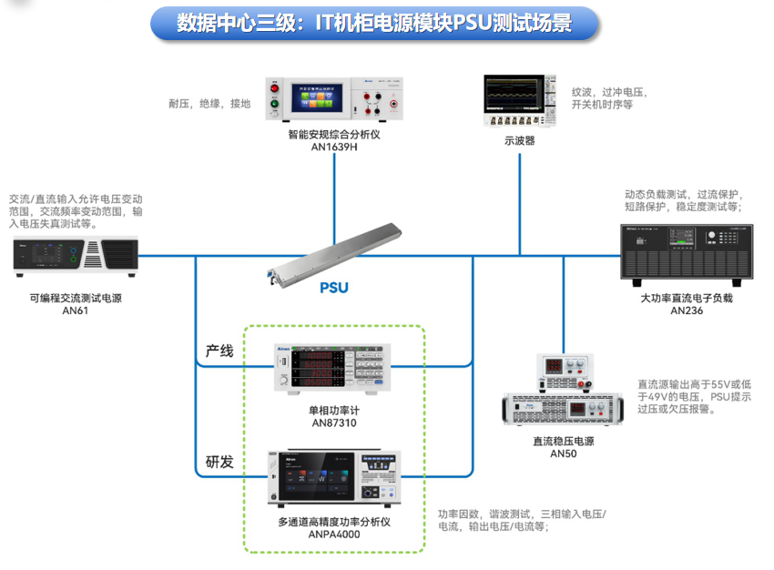 受人工智能的AI算力需求爆发式增长驱动,AIDC数据中心电源市场步入高速发展阶段。艾诺仪器针对AIDC的高功率密度、高可靠性供电需求,推出了AIDC数据中心电源全场景测试方案,包含交直流测试电源,功率分析仪,直流电子负载,安全性能综合分析仪,可满足UPS、HVDC、ITROCK、Power Shelf、PSU、BBU、BBU DC/DC、DC/DC Converter等8大核心测试应用。