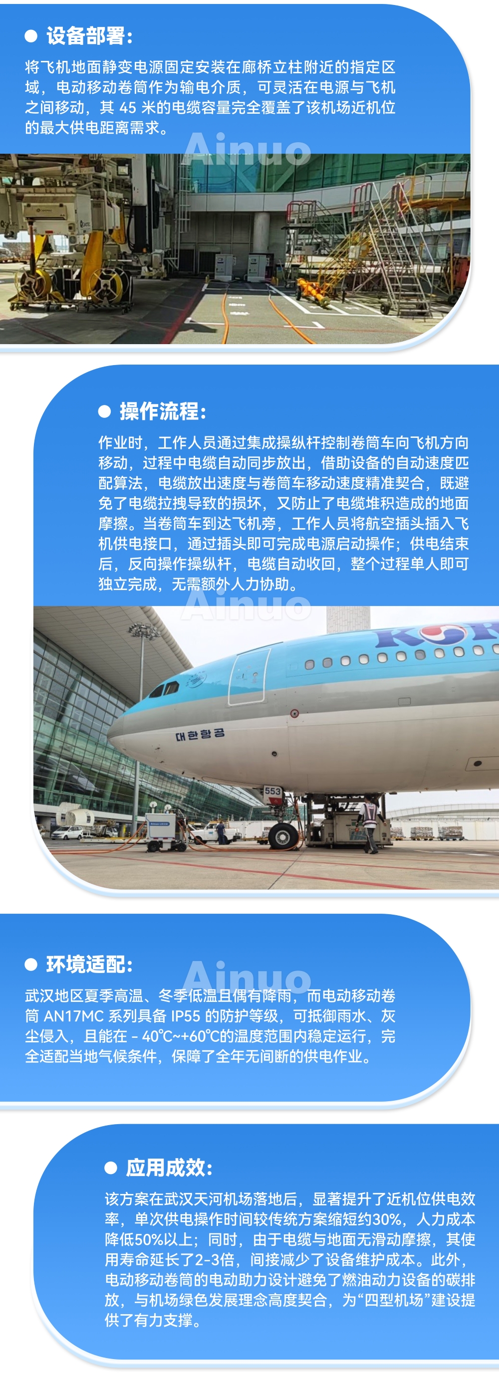 此次电动移动卷筒 AN17MC 系列在武汉天河机场的成功应用,再次证明了艾诺仪器产品的可靠性和适用性。该方案不仅为武汉天河机场解决了近机位远距离供电的难题,提升了机场的运营效率和服务质量,还为机场的绿色发展注入了新的动力。