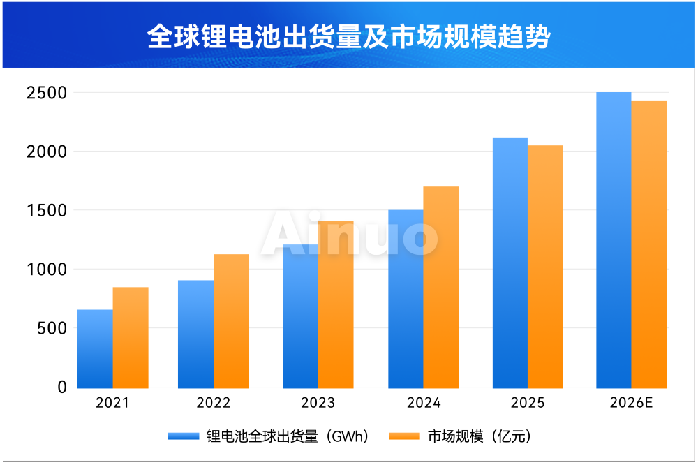 近年来在电动汽车和储能市场的双重驱动下,我国锂电池出货量从2021年的640GWh增长到2024年的1500GWh。预计2026年,全球锂电池出货量将突破2500GWh,市场规模将达到2400亿美元,标示着锂电池行业步入了高速发展时期。